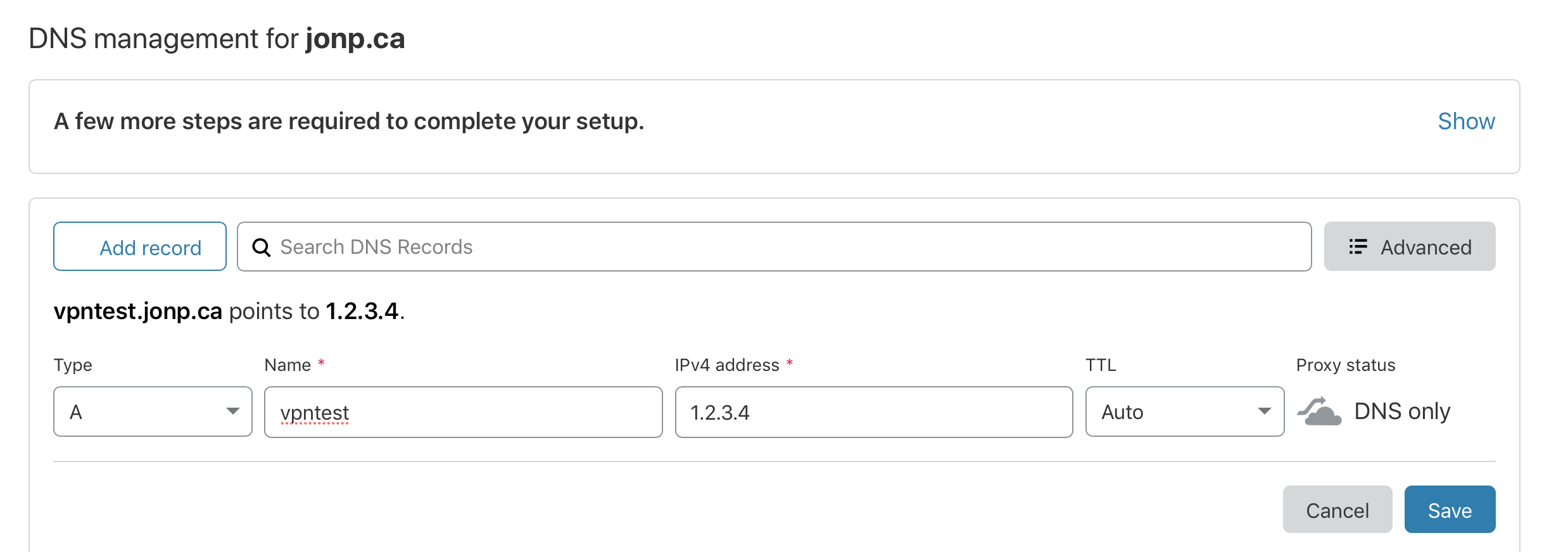 In Cloudflare, add an A record for the domain you want to use. This must be done the first time, then our script will update it each time after this. You can use the IP of your existing VPS, or a fake IP address, since these will be updated.