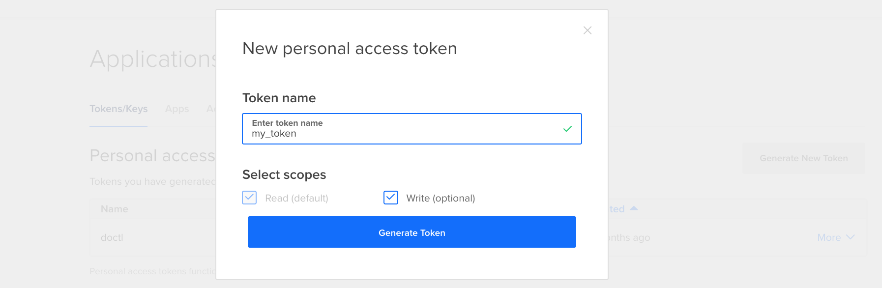 Head over to https://cloud.digitalocean.com/account/api/tokens/new to generate your token.