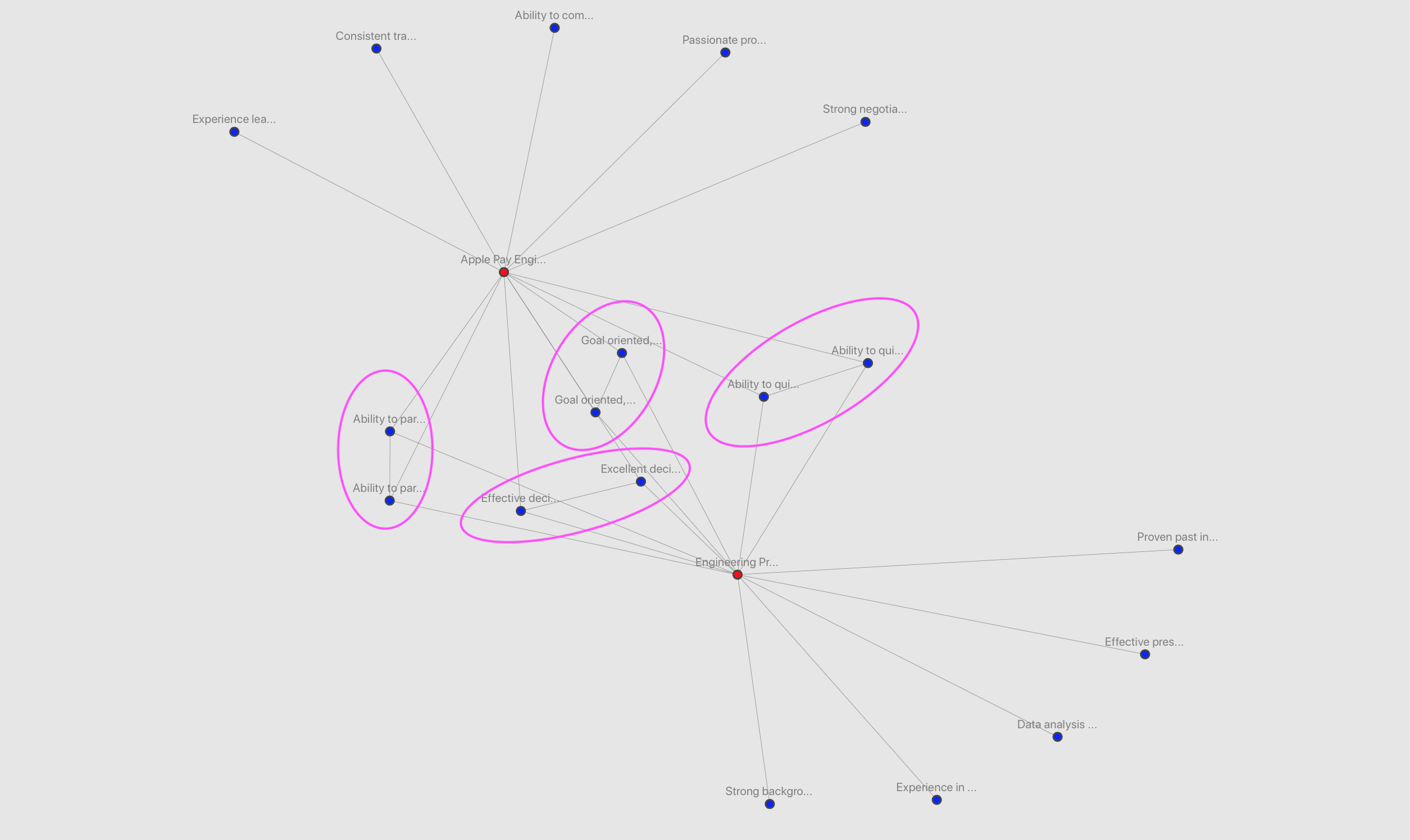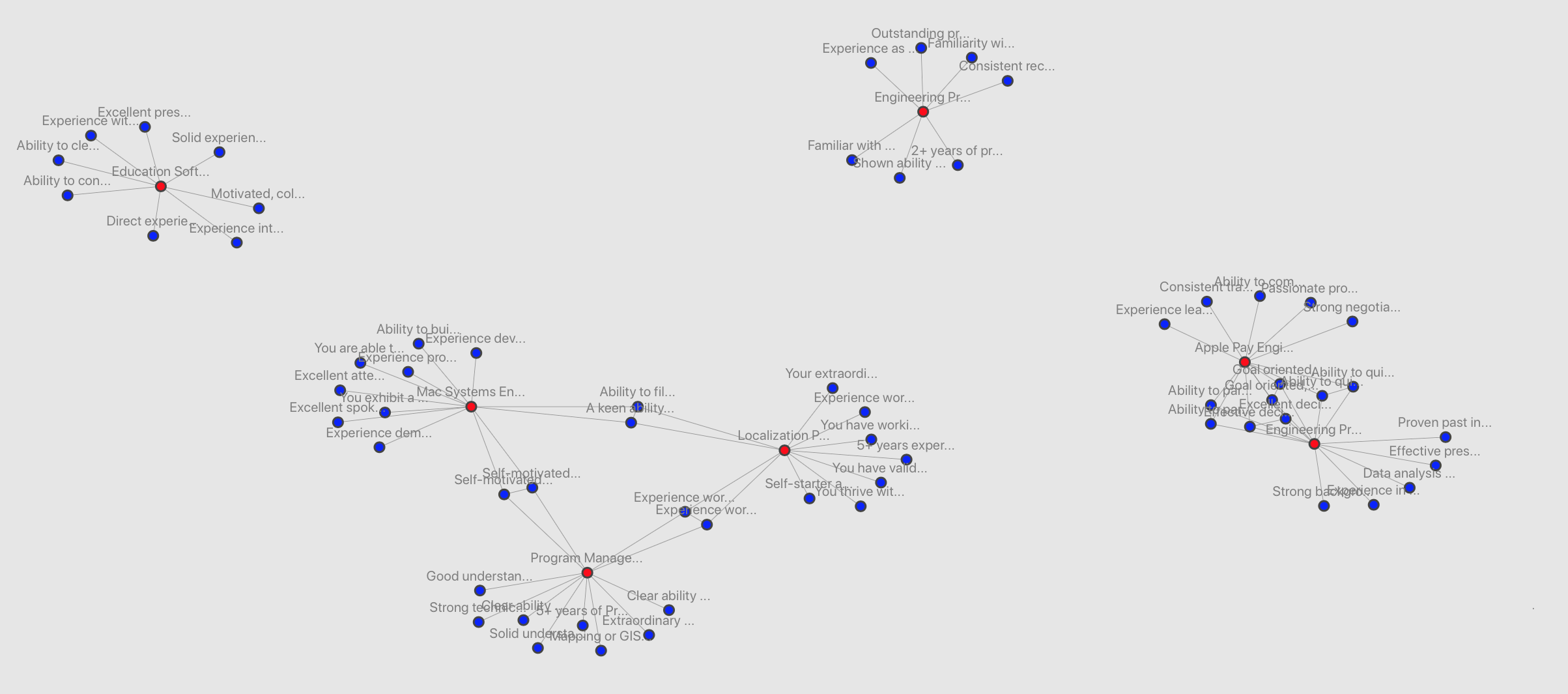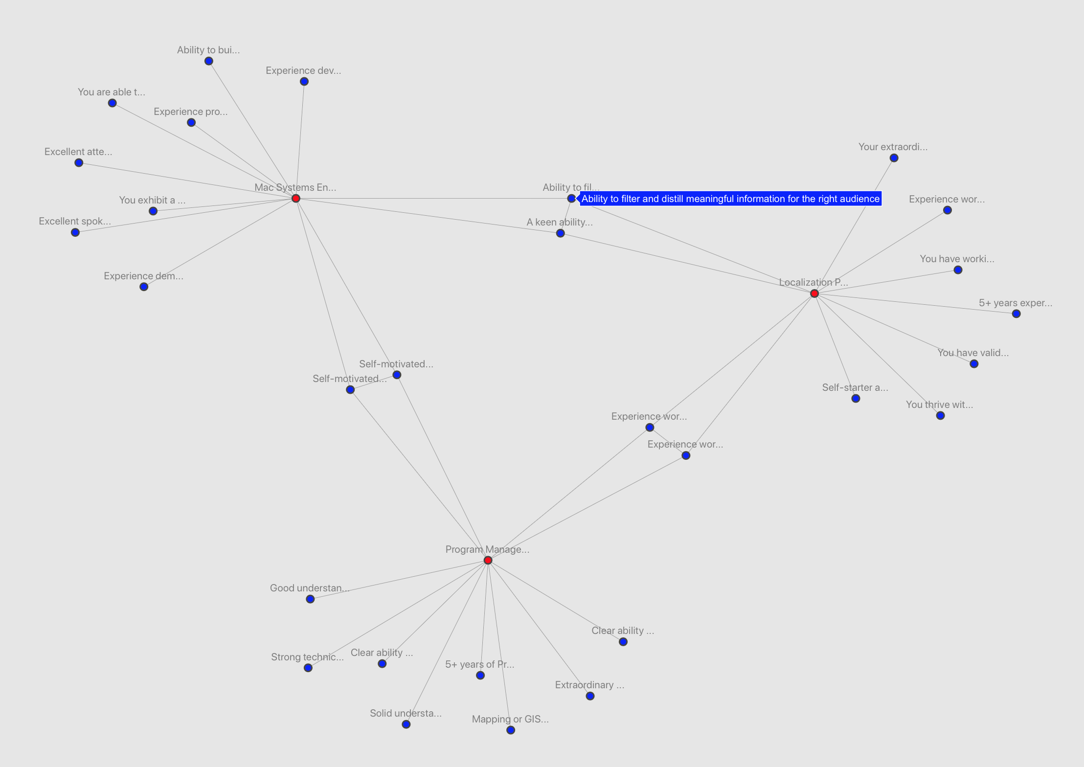 Of course, improving legibility and making it easier to understand connections can still be worked on. But it's easy to see that some roles have more overlap than others. At the same time, some qualifications say so much that they might as well be describing every role, like this: "Goal oriented, highly motivated and able to work under minimal supervision in a cross-functional environment at detailed levels whilst taking account of interdependencies at higher levels".