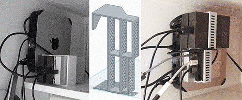 Mac Mini is already wall-mounted (left photo), but has 3 USB drives plugged into it. This mount (middle photo) attaches to the side of the mini and holds 3 drives (+ USB-C hub) so that everything is wall-mounted (right photo).